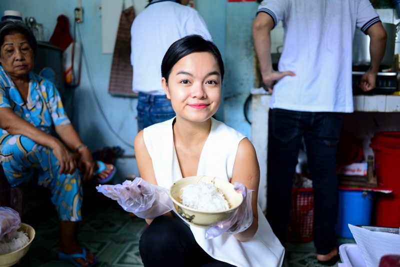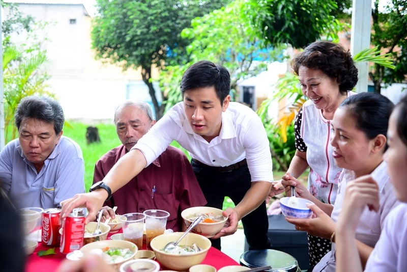 | Các cô chú nghệ sĩ tại Viện dưỡng lão rất hào hứng và đặc biệt tỏ ra thích thú với món bún mọc do chính tay Mai Phương Thúy chuẩn bị. |