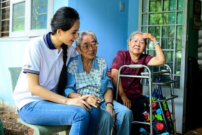 | Mai Phương Thúy dành rất nhiều thời gian để thăm hỏi hoàn cảnh và sức khỏe của từng cụ. |