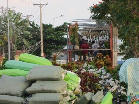 | Hoa kiểng Tết từ các tỉnh miền Tây đổ về thành phố vắng bóng chậu có giá trị cao. |