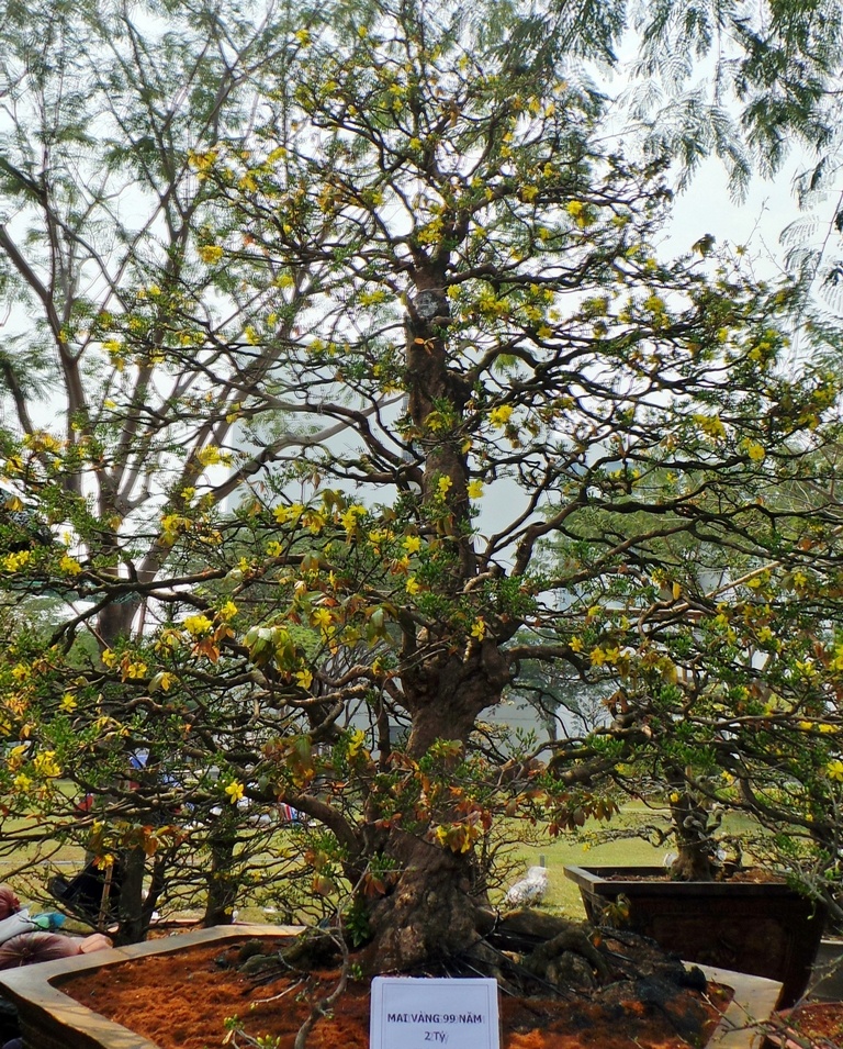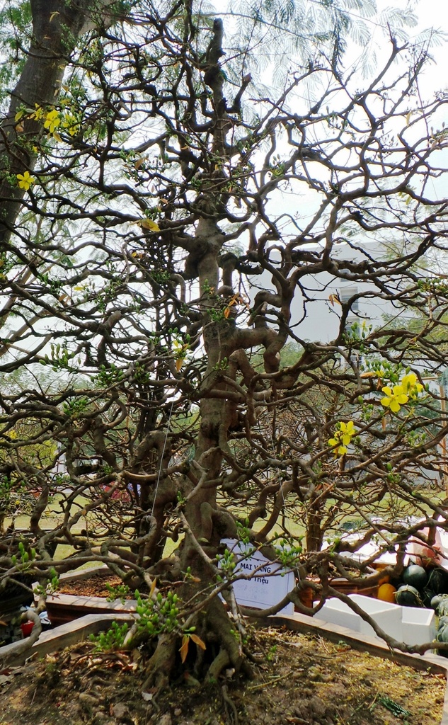 | Cây mai cao khoảng 4 m, tán hơn 3 m, gốc theo thế xoắn vắt áo rất hiếm. Bộ rể của "lão" mai to lớn, nổi lên khỏi mặt chậu. Cây này được nghệ nhân mua về cách đây hơn 9 năm và bỏ nhiều tâm huyết chăm sóc. |