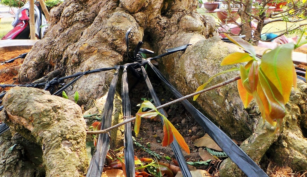 | Bộ rễ mai to khỏe. Nhiều nhánh và nụ hoa mọc từ bệ rễ chắc chắn này càng làm cho "lão" mai vàng thêm cổ kính, độc đáo. |