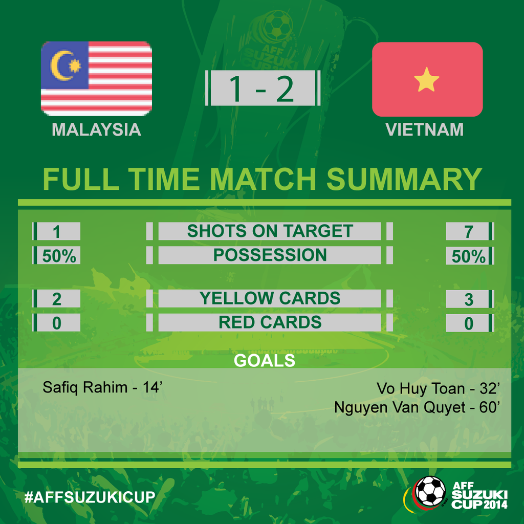 Đúng lúc này trọng tài người Trung Quốc Ma Ning thổi còi kết thúc trận bán kết lượt đi AFF Cup 2014 giữa Malaysia và đội tuyển Việt Nam. Chung cuộc đội quân của HLV Miura giành chiến thắng 2-1.