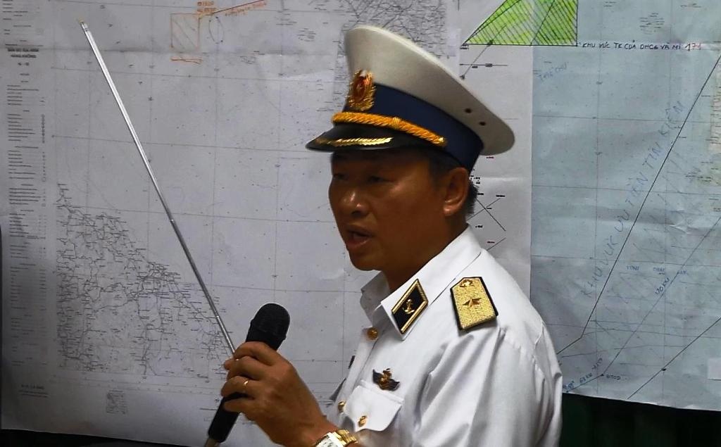 | Chuẩn đô đốc Lê Minh Thành trình bày vị trí tìm kiếm trong ngày hôm nay của lực lượng Việt Nam. |