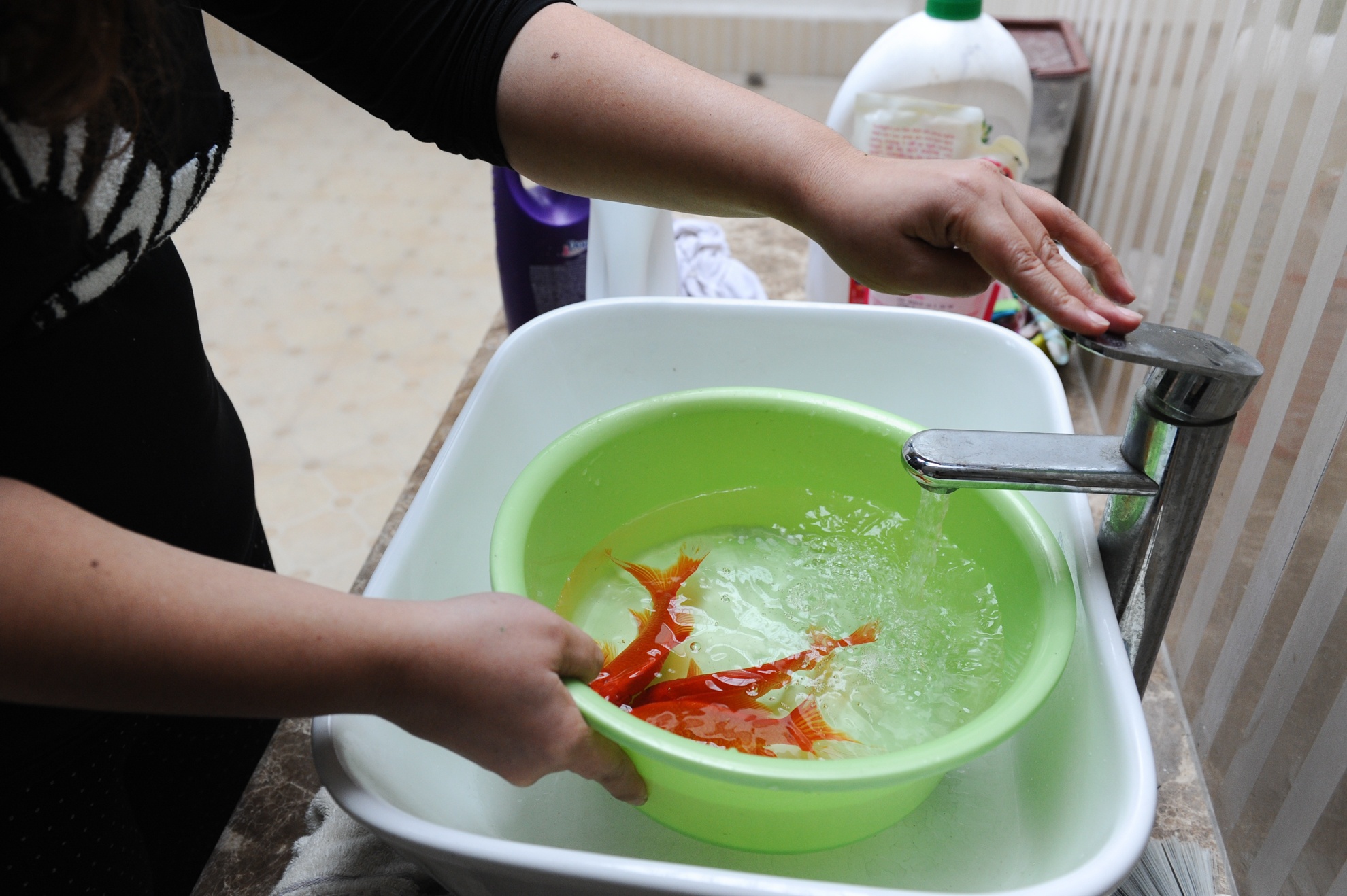 | Ba con cá chép đỏ đã được chị Trang mua sẵn để đặt lên bàn thờ thắp hương cúng ông Táo. |