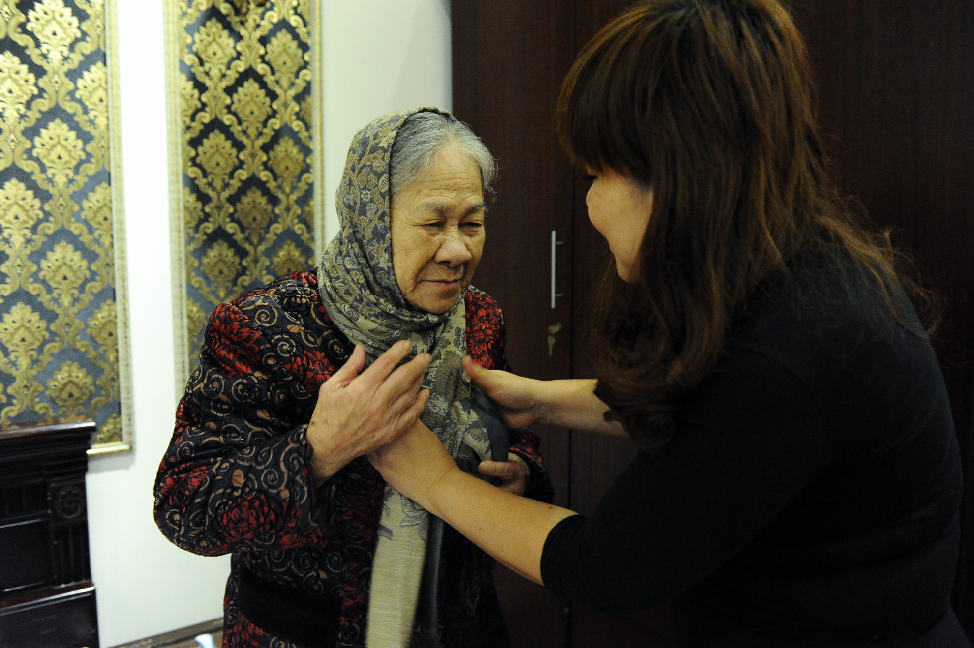 Sau khi chuẩn bị xong xuôi, chị Trang lên phòng mặc quần áo cho mẹ chồng của mình, bà đã 84 tuổi. |