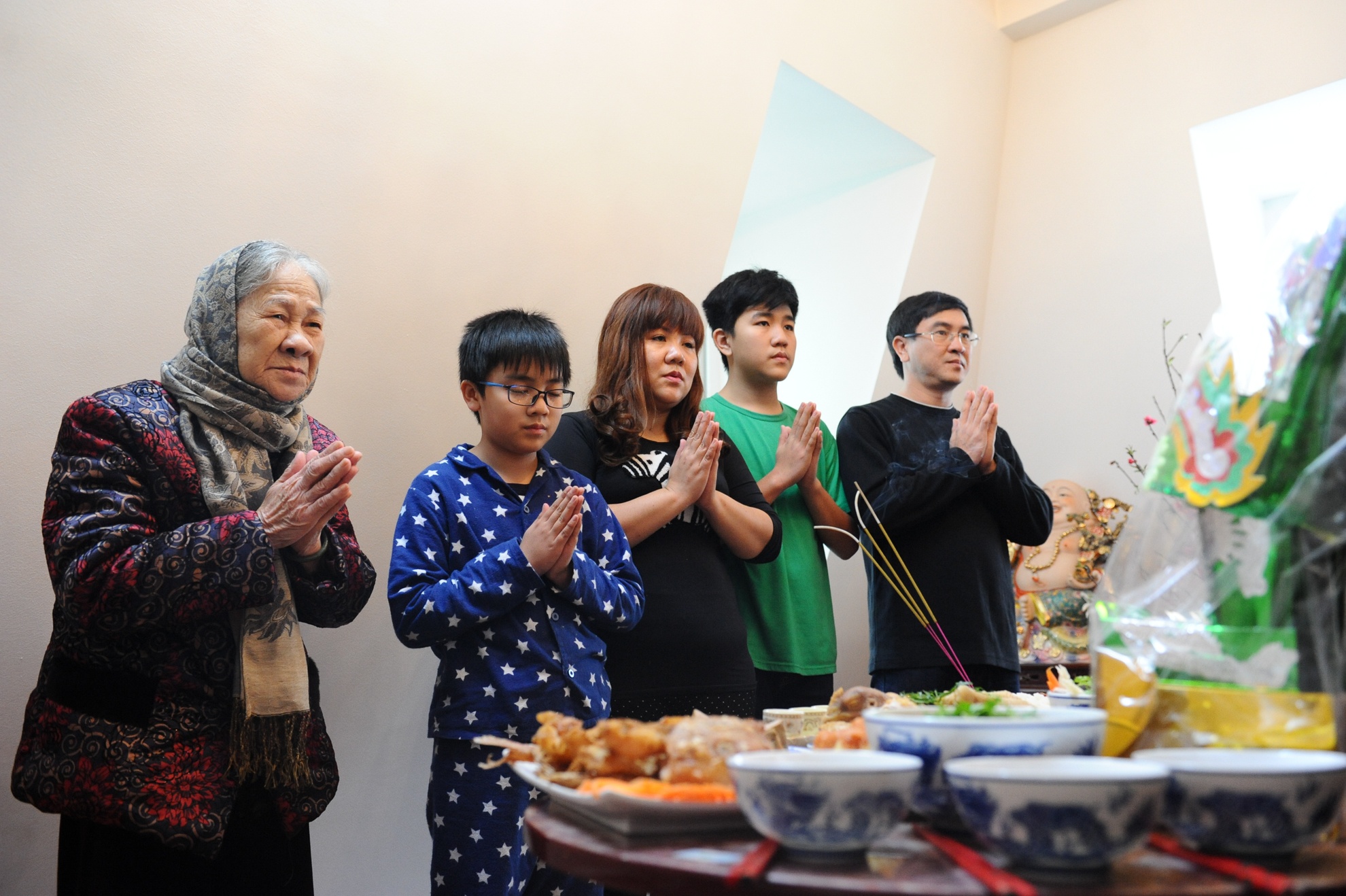 Cả gia đình đứng trước ban thờ khấn và cầu chúc cho một năm cũ qua đi êm đềm và những điều may mắn sẽ tới.