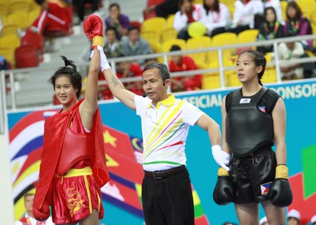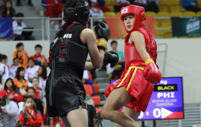 | Theo lời chỉ dẫn của HLV, Thu Hoài liên tục ra những đòn chân và tay hướng về đối thủ Evita của Philippines. |