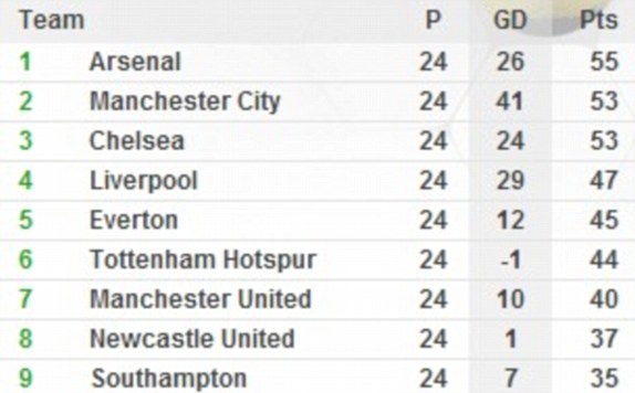 Để thua với tỷ số cách biệt tối thiểu 0-1 trước Chelsea, Man xanh không thể đòi lại ngôi đầu bảng từ tay Arsenal. Sau vòng 24, Chelsea cùng được 53 điểm với Man City nhưng xếp thứ 3 do kém hiệu số bàn thắng thua (24 so với 41).