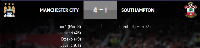 Trên sân Etihad, trọng tài Chris Foy lần thứ 2 thổi phạt penalty sau tình huống Zabaleta của Man City phạm lỗi với cầu thủ bên phía đội khách. Trong pha bóng đối mặt với Joe Hart, Lambert không mắc sai lầm khi đem về bàn gỡ hòa 1-1 cho Southampton.