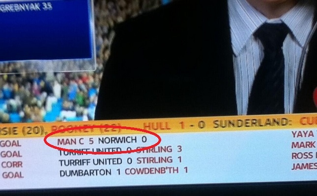 60': Tiền vệ Yaya Toure đã tung ra cú sút phạt đẳng cấp ngay trước khu vực trung lộ không cho thủ thành Ruddy cơ hội cản phá. Tỷ số tiếp tục được nâng lên 5-0 cho Man City.