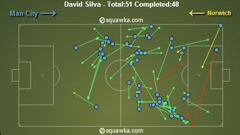 | Tỷ lệ chuyền bóng của David Silva trong 45 phút đầu tiên gần đạt tuyệt đối. Tiền vệ người Tây Ban Nha đã thực hiện thành công 48/51 đường chuyền. |