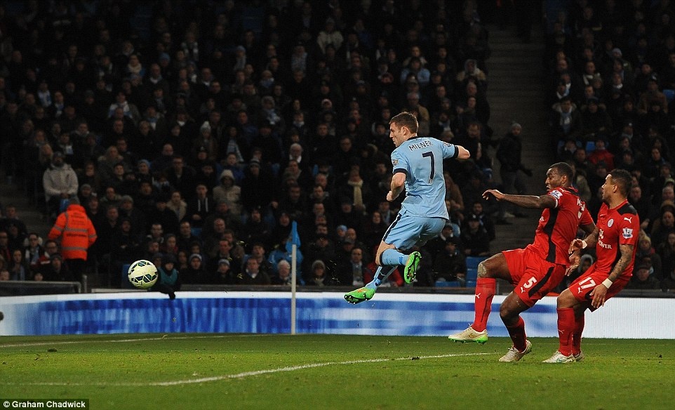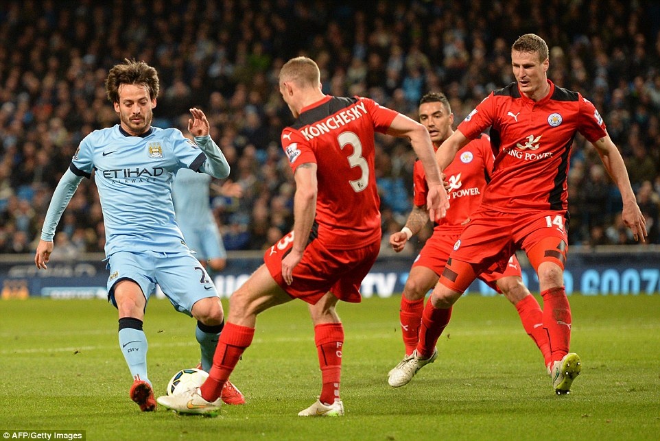 | Những nỗ lực dồn ép của Man City được đền đáp ở phút 45+2. Sau pha bóng phối hợp như đá tập, bóng đến chân David Silva và ngôi sao người Tây Ban Nha cần hai cú dứt điểm để đưa bóng vào lưới Leicester City. |