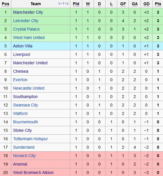 Man City dẫn đầu bảng xếp hạng nhờ có chỉ số phụ tốt hơn những đội cùng giành chiến thắng ở vòng 1 Premier League.