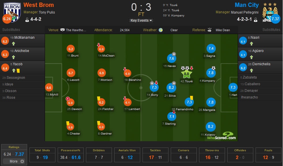 Cú sút của Yaya Toure ở sát vạch 16m50 trúng chân Craig Dawson bên phía đội chủ nhà. Bóng đi đổi hướng khiến thủ môn Myhill bất lực nhìn bóng vào lưới West Brom.