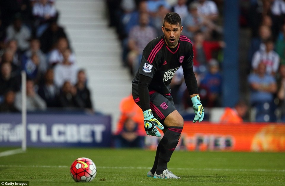 Thủ môn Myhill của West Brom bay người nỗ lực cản phá, nhưng không thành công khi bóng đi vào góc cao khung thành.