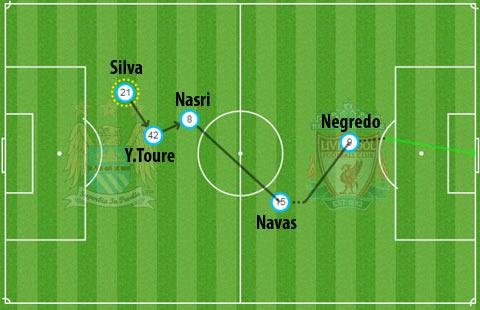 Man City không chỉ có những cá nhân xuất thần mà ấn tượng của họ mùa này là lối chơi đồng điệu, đẹp mắt và hiệu quả. Ví dụ mới nhất là pha phản công hạ gục Liverpool 2-1. Cướp bóng từ chân đối thủ, Yaya Toure chuyền ngắn cho Nasri, rồi bóng đến Navas để anh này chọc bóng vào khe giữa Skrtel và Sakho. Negredo chạy chỗ đón đường bóng cuối rồi dứt điểm má ngoài hạ gục Mignolet. Thời gian từ khi bóng rời sân Toure đến khi vào lưới chỉ kéo dài đúng… 7 giây.