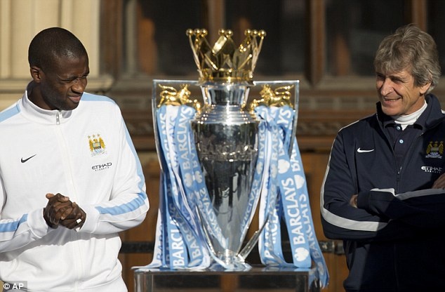 | HLV Pellegrini và tiền vệ xuất sắc nhất mùa giải của Man City, Yaya Toure bên chiếc cúp vô địch Ngoại hạng Anh. |
