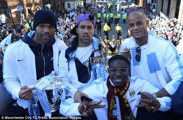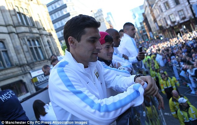 | Jesus Navas và đồng đội phấn phích khi chứng kiến cảnh rất nhiều CĐV Man City chào đón đội bóng. |
