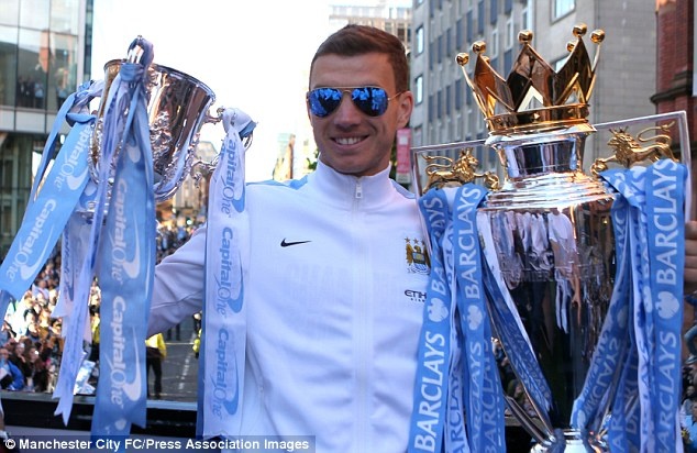 | Tiền đạo Dzeko khoe 2 chiếc cúp. |