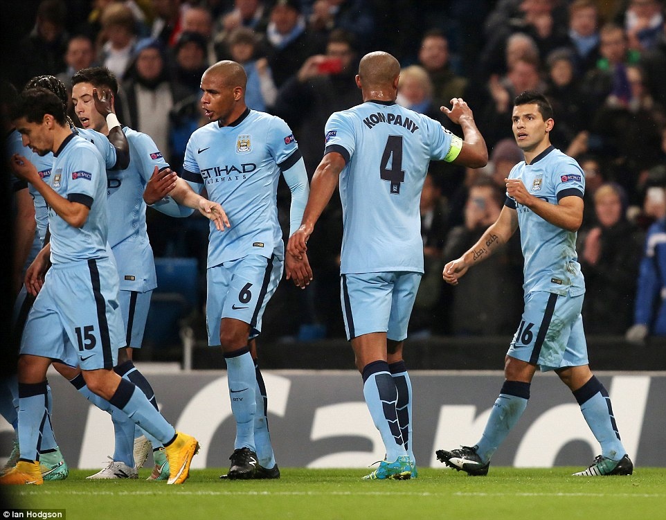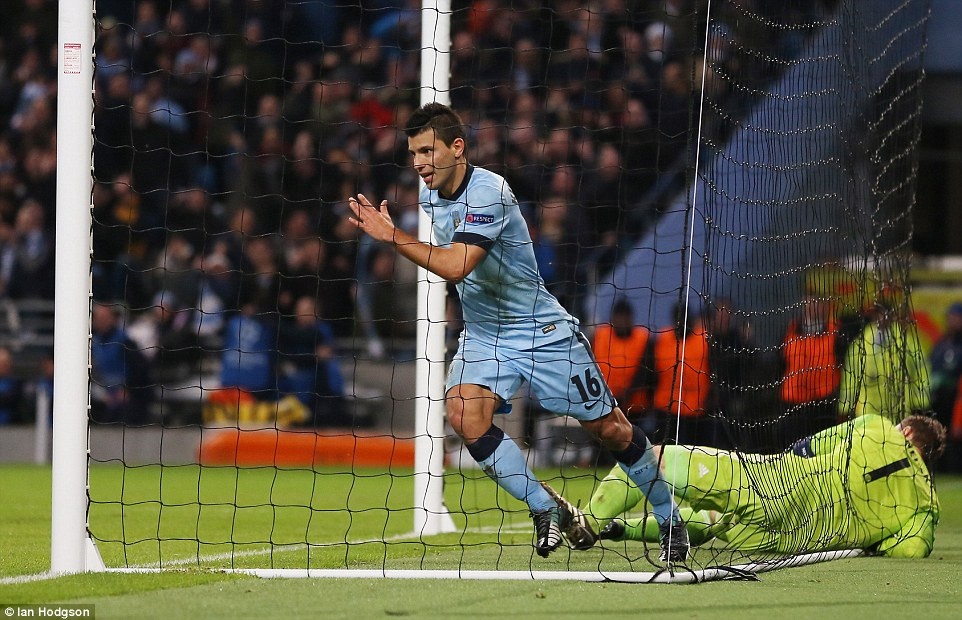| Niềm vui của Aguero khi thắp lên hy vọng đi tiếp của Man City. Bởi nếu thua trận này, Man xanh gần như không còn cơ hội tiến vào vòng knock-out. |