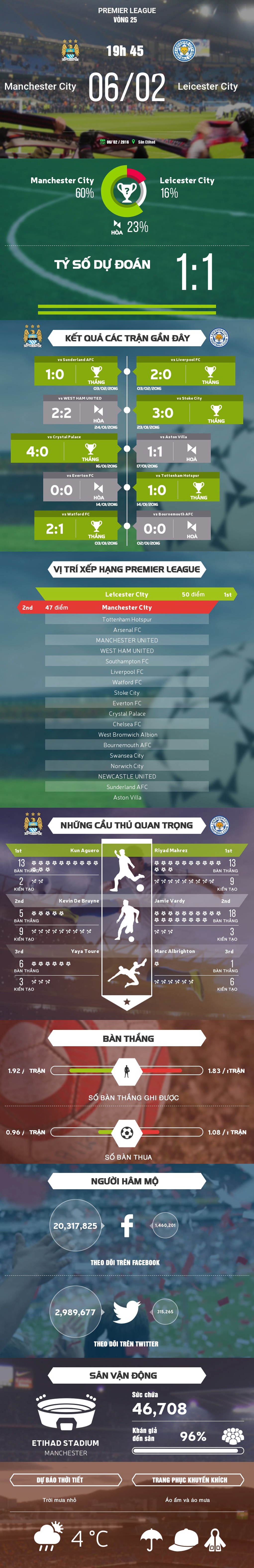 Leicester hiện đứng vị trí số 1 trên bảng xếp hạng Premier League, nhưng họ sẽ mất ngôi đầu nếu thua khi làm khách đến sân của Man City ở vòng 25 lúc 19h45 ngày 6/2.