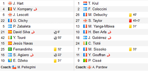 So với những trận giao hữu trước khi mùa giải 2013/14 khởi tranh, HLV Pellegrini có một chút điều chỉnh đội hình thi đấu của Man City. Trên hàng công, tiền đạo Sergio Aguero được tin dùng từ đầu sau khi bình phục chấn thương. Chân sút người Argentina đá cặp cùng Edin Dzeko trong đội hình 4-4-2 của Man City ở trận tiếp đón Newcastle trên sân nhà Etihad.