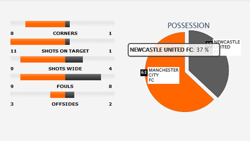 Do chơi thiếu người, nên Newcastle gặp nhiều khó khăn trong việc triển khai tấn công và đành bất lực trước nhiệm vụ ghi một bàn thắng danh dự vào lưới Man City. Sau 90 phút ở trận ra quân tại giải Ngoại hạng Anh, đoàn quân của HLV Alan Pardew ra về trong cảnh trắng tay khi để thua với tỷ số 0-4 trước đội chủ sân Etihad.