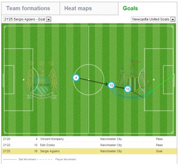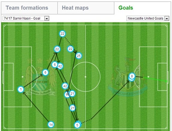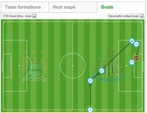 Ngay sau đó, Newcastle đáp trả bằng cú dứt điểm từ xa nhưng không thành công của Ben Arfa. Bàn thắng phá vỡ thế cân bằng của trận đấu diễn ra ở phút thứ 6. Từ đường chuyền vào của Edin Dzeko, thủ môn Tim Krul đẩy bóng ra, và David Silva lao vào đánh đầu bồi mở tỷ số cho Man City. Bàn thắng dẫn trước giúp các học trò của HLV Pellegrini thi đấu tự tin hơn trong những phút sau đó.