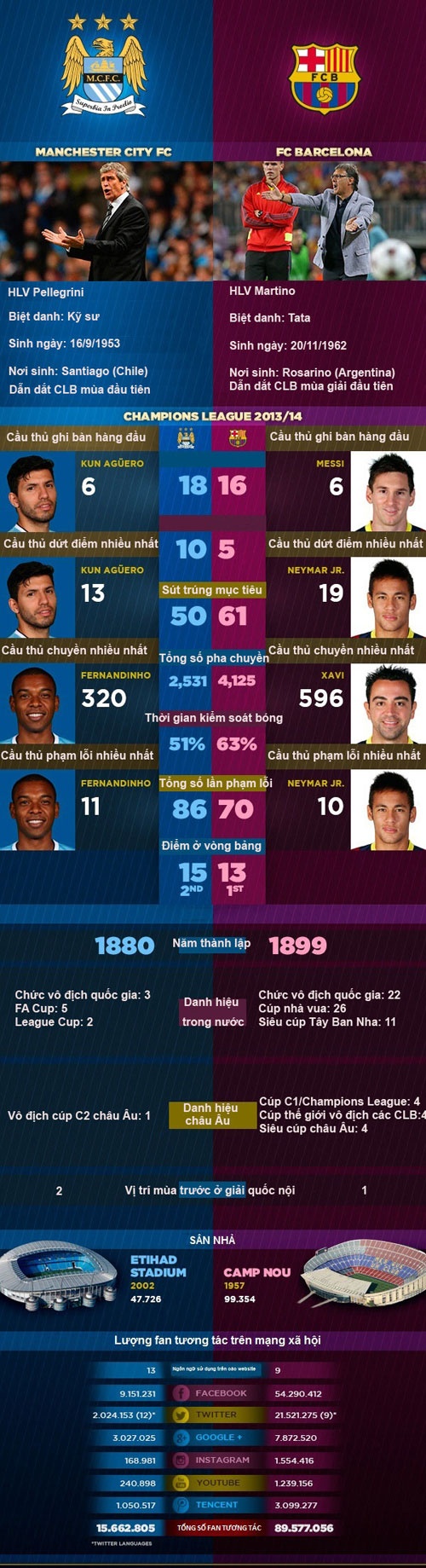 Barca đã giành hơn 70 danh hiệu cao quý, trong đó có 4 chức vô địch châu Âu, còn Man City mới sở hữu 11 chiếc cúp bạc khiêm tốn.