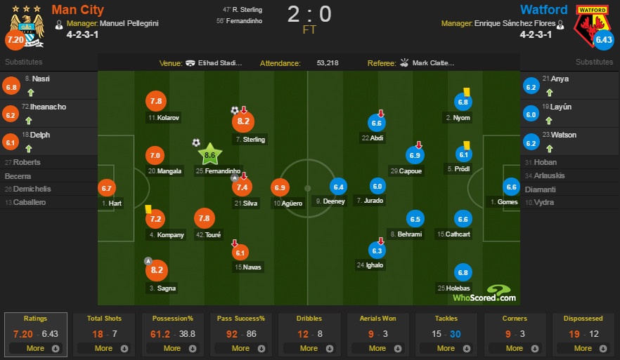 Khác với những chiến thắng ấn tượng ở 3 vòng đầu, Man City nhập cuộc có phần chậm chạp trong cuộc tiếp đón tân binh Watford. Tuy nhiên, sự tỏa sáng của những ngôi sao vẫn giúp thầy trò huấn luyện viên Manuel Pellegrini giành trọn 3 điểm quan trọng để tiếp tục vững vàng trên ngôi đầu.