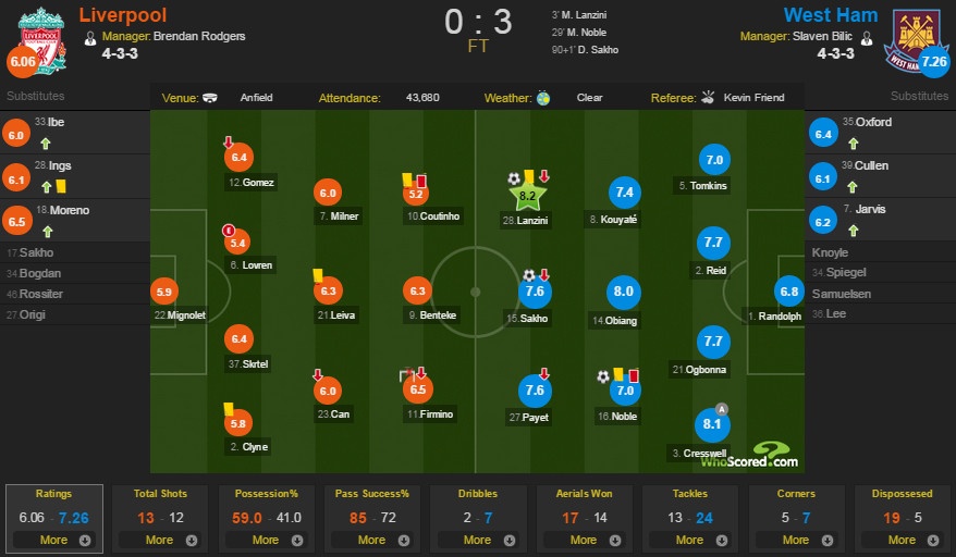Trái ngược với chiến thắng nhẹ nhàng của Man Xanh, Liverpool trải qua 90 phút thất vọng ngay trên sân nhà Anfield. Được đánh giá cao hơn rất nhiều so với West Ham nhưng đoàn quân của huấn luyện viên Brendan Rodgers lại nhận thất bại toàn diện 0-3.