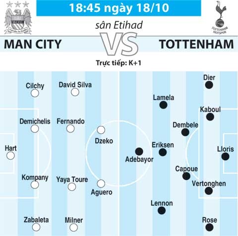 Đấy là chưa kể, Spurs tối nay còn bị ảnh hưởng đáng kể về lực lượng. Thủ thành Hugo Lloris dính chấn thương trong loạt trận giao hữu cùng ĐT Pháp và chưa rõ kịp bình phục hay không? Nghiêm trọng nhất là trường hợp của tiền vệ Nacer Chadli. Nếu Chadli không thể ra sân tối nay, đó sẽ là tổn thất cực lớn cho Tottenham bởi anh đã ghi 4 bàn và có 1 pha kiến tạo tại Premier League 2014/15. Đấy là chưa kể, Spurs còn rất kém cỏi ở đại chiến. Trong 10 lần gần nhất đối đầu Man City, Liverpool, Chelsea và Arsenal, Spurs giành được đúng 2 điểm, ghi 3 bàn nhưng phải nhận 31 bàn thua.