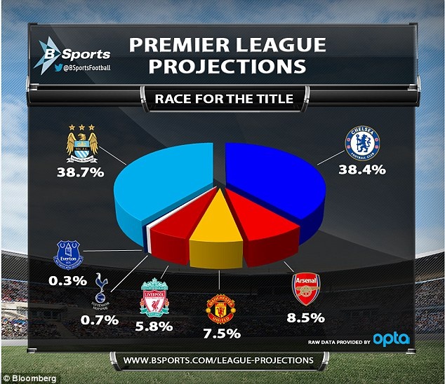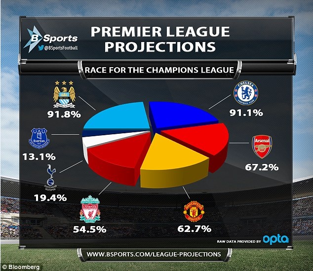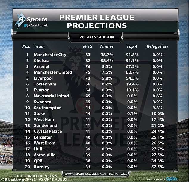 Theo đánh giá của hãng phân tích dữ liệu nổi tiếng Bloomberg, Man City sẽ bảo vệ thành công ngôi vương Premier League, trong khi M.U sẽ cán đích trong top 4 mùa giải 2014/15.