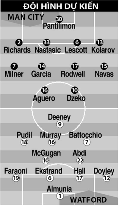 Man City sẽ không có Negredo và Nasri do chấn thương. Nhưng nếu HLV Pellegrini sử dụng cả Aguero và Dzeko thì đây sẽ là một màn tập bắn không hơn không kém. Cần nhớ ngay cả khi Man City thay 2 tiền vệ Yaya Toure và Fernandinho bằng Garcia và Rodwell, thì tổng giá trị của 2 cầu thủ đó cũng hơn 40 triệu bảng, tức là nhiều hơn giá trị của toàn bộ đội hình Watford.