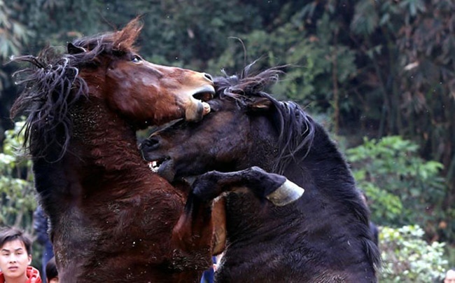 | Tại làng Tiantou, hàng trăm khán giả tập trung chỉ cách "sàn đấu" vài mét mà không có hàng rào bảo vệ. Ở giữa vòng vây, 15 con ngựa đấu xoay vòng đến khi một con chiến thắng. |