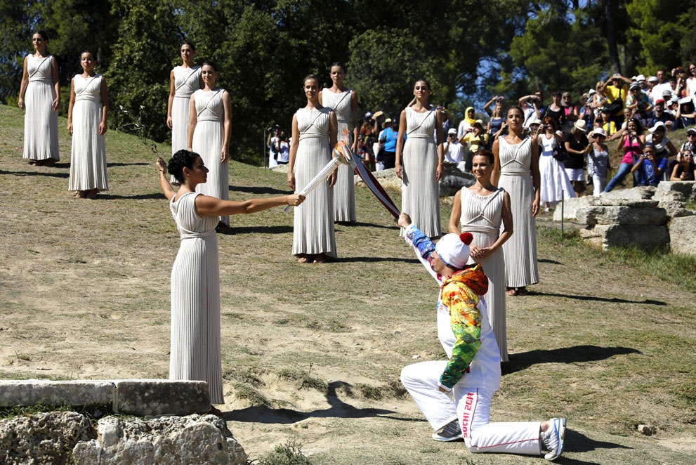 | Nữ diễn viên Hy Lạp Ino Menegaki nhận ngọn đuốc từ tay vận động viên Yannis Antoniou, người vinh dự thắp ngọn đuốc đầu tiên của kỳ Thế vận hội 2014. |