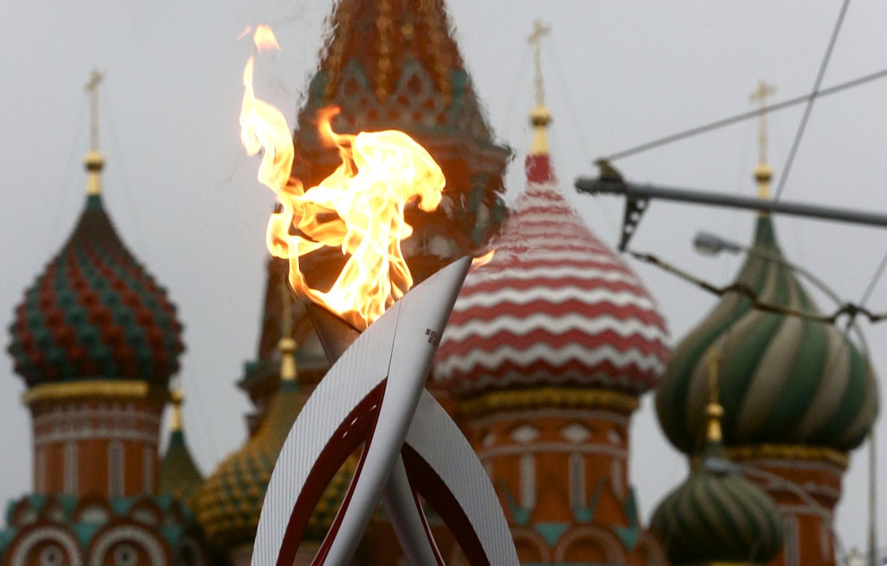 | Ngọn đuốc Olympic được thắp sáng tại nhà thờ Basil tại Moscow. |