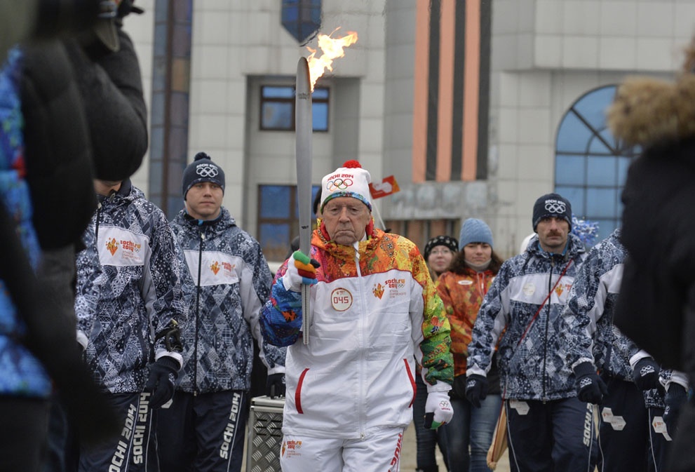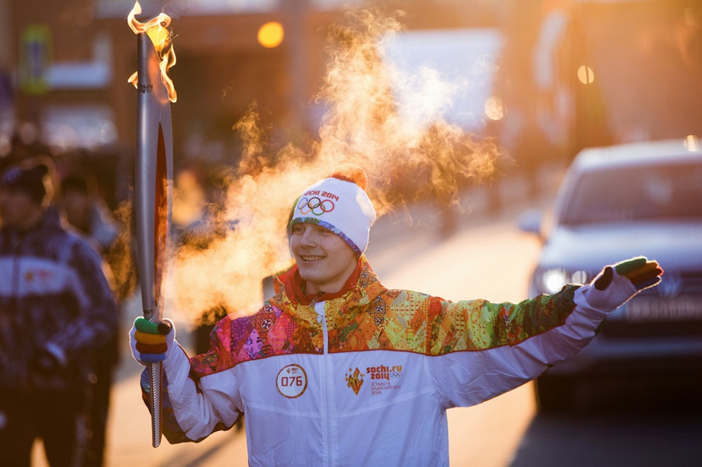 | Vận động viên Evgeny Nefedov đốt lên ngọn lửa Olympic tại thành phố Siberia, Divnogorsk. |
