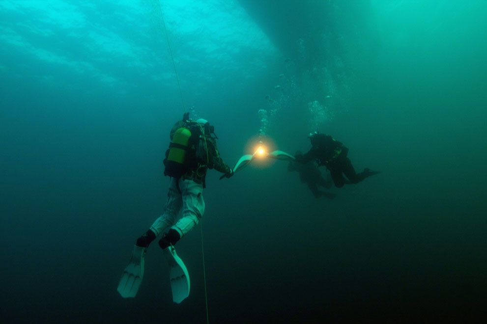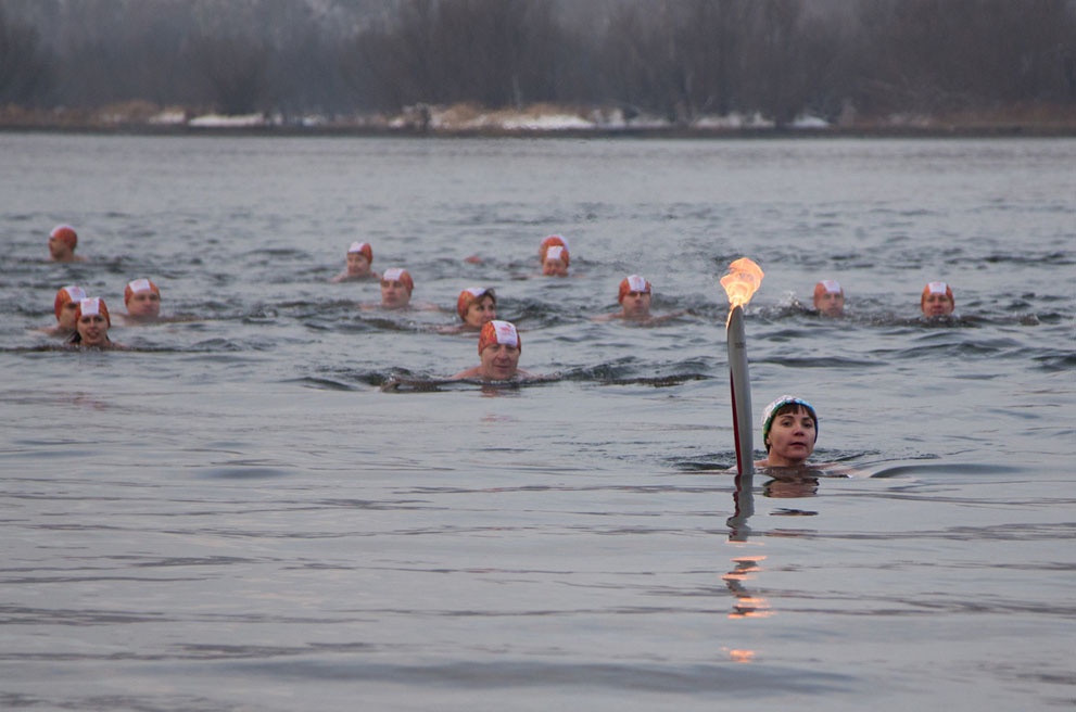 | Vận động viên Mikahil Chuyev sử dụng một động cơ phản lực di động dưới nước để mang ngọn lửa tới hồ Baikal ở Siberia. |