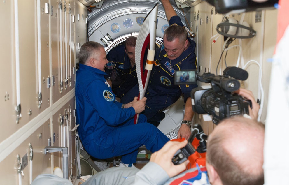 | Phi hành gia người Nga Fyodor Yurchikhin giương cao ngọn đuốc Olympic bên trong trạm vũ trụ quốc tế Rassvet Mini. |