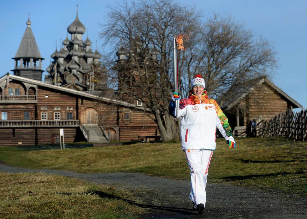 Mang ngọn đuốc chạy quanh bảo tàng quốc gia bằng gỗ lâu đời trên đảo Kizhi, gần hồ Onega, Karelia.
