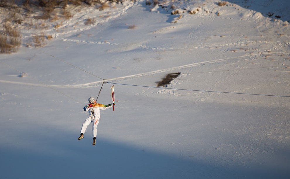 Di chuyển bằng dây cáp để rước đuốc tại Tyumen, Tây Siberia.