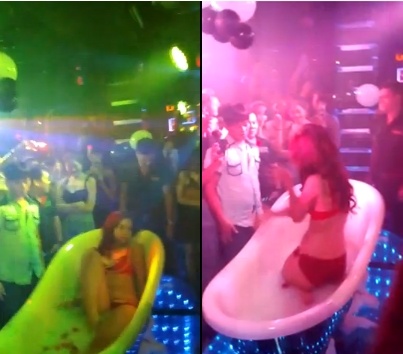 Sau khoảng 1 phút "khởi động" trên sàn diễn, cô gái bắt đầu thực hiện màn tắm sữa gợi dục bên trong bồn tắm được đặt ngay trên sân khấu biểu diễn của quán bar.