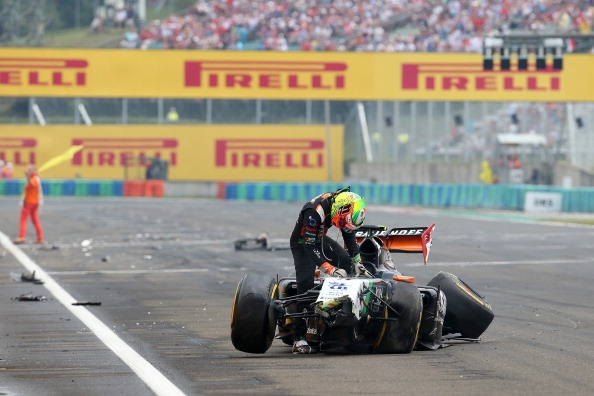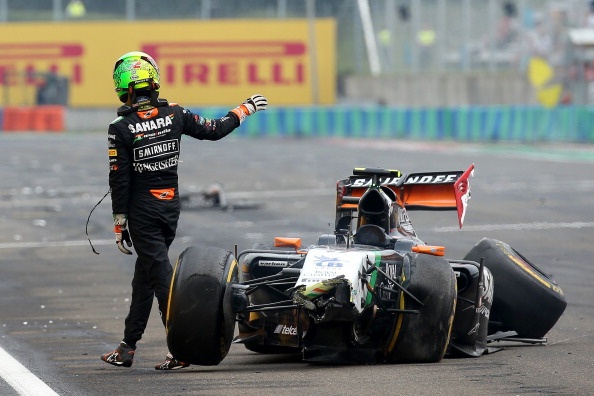 | Dù trời ngớt mưa và mặt đường đã trở nên khô ráo song đến vòng 22, tai nạn tiếp tục xảy ra. Cú va chạm cực mạnh vào rào chắn khiến chiếc xe mà Sergio Perez (Force India) cầm lái nát bét. |
