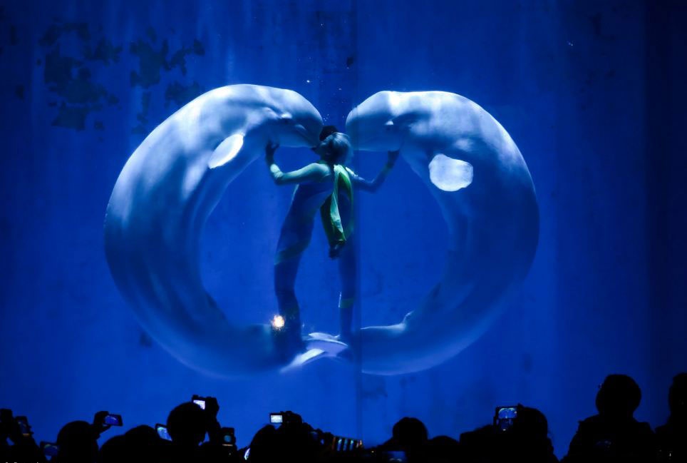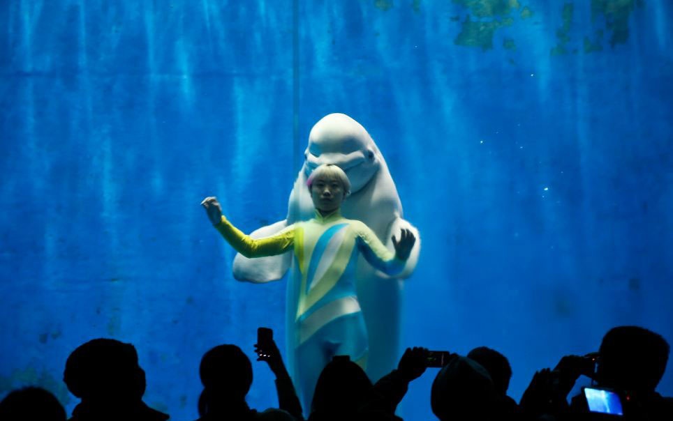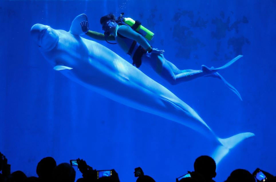 | Hai chú cá voi trắng biểu diễn cùng huấn luyện viên tại thủy cung Harbin Pole ở thành phố Cáp Nhĩ Tân, tỉnh Hắc Long Giang. Ảnh: Getty Images |