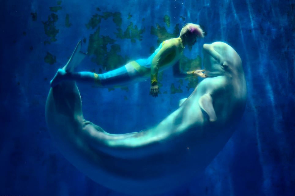 | Một chú cá voi trắng biểu diễn tư thế khó với thợ lặn dưới nước. Ảnh: Getty Images |