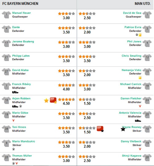 Sau trận đấu, Rooney chỉ nhận điểm 1,5, thấp nhất trong số cầu thủ ra sân của đội. Bên phía Bayern, Robben là cầu thủ xuất sắc nhất với 1 đường kiến tạo và trực tiếp ghi bàn ấn định chiến thắng 3-1 cho Hùm xám xứ Bavaria bằng một pha đi bóng và dứt điểm kỹ thuật.