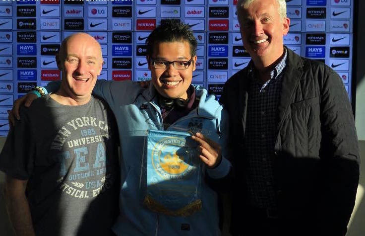 | Anh Nguyễn Phạm Minh Trí (giữa) - Phó chủ tịch MCFC TP HCM, Trưởng ban Đối ngoại Hội CĐV Manchester City tại Việt Nam nhận cờ công nhận Hội viên chính thức từ đại diện "Man xanh". |