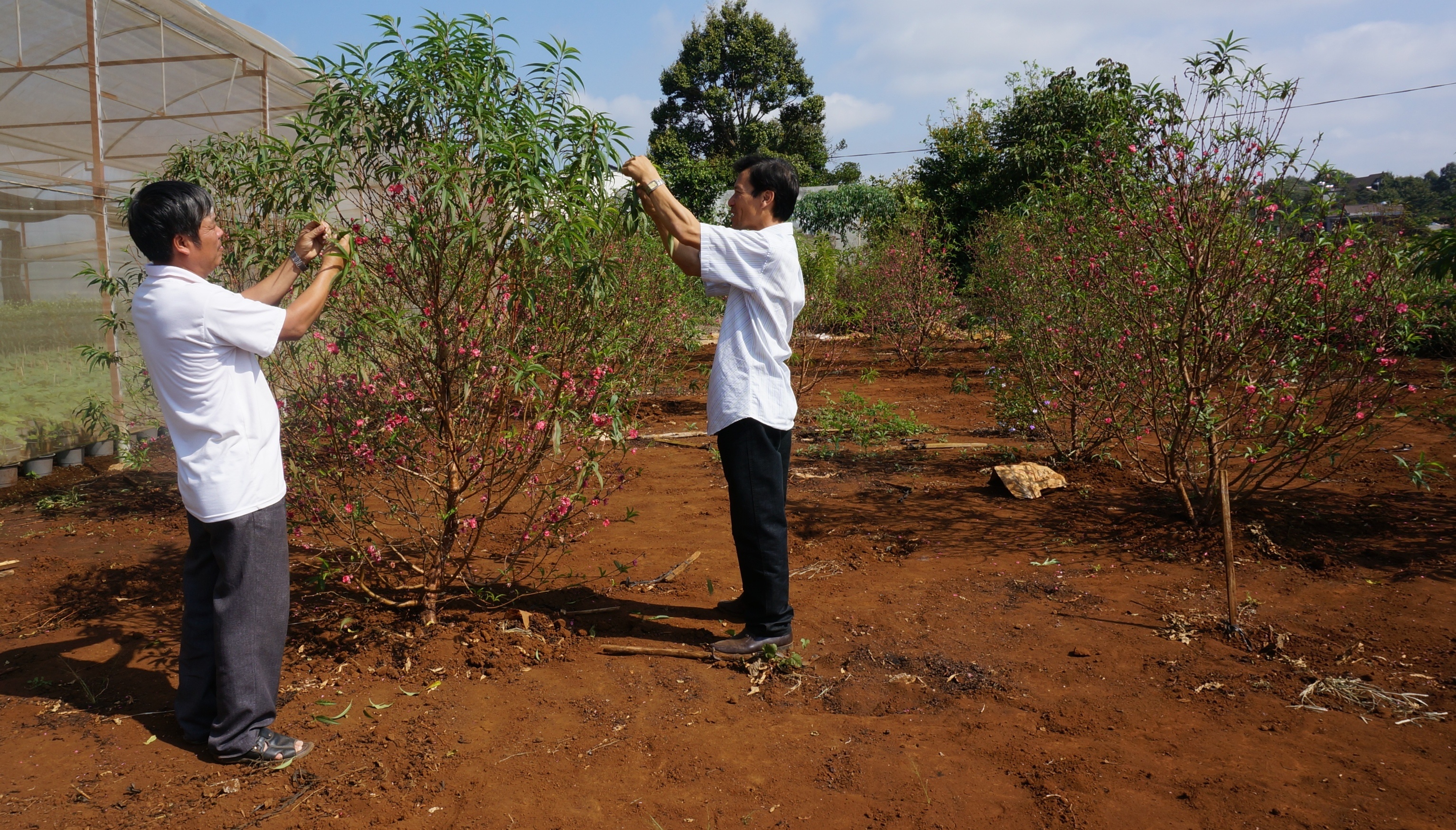 Tương tự, vườn đào của ông Trần Đức Trung (44 tuổi, ngụ tổ dân phố 5, thị trần Đắk Mil) cũng đang đua nhau nở. Ông Trung cho biết, hoa thuộc giống đào Nhật Tân, được mua về từ Nam Định và trồng thử nghiệm ở Đắk Mil thời gian gần đây. Năm nay, khu vườn nhà ông có hơn 100 gốc đào nhưng hơn nửa đã nở.