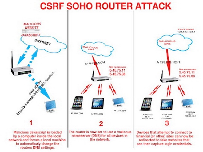 | Giải thích cơ bản về cuộc tấn công nhắm vào bộ định tuyến (router), và khi đã chiếm giữ (2) có thể điều hướng các thiết bị truy cập vào mạng đến trang web mã độc - Nguồn: Team Cymru. |